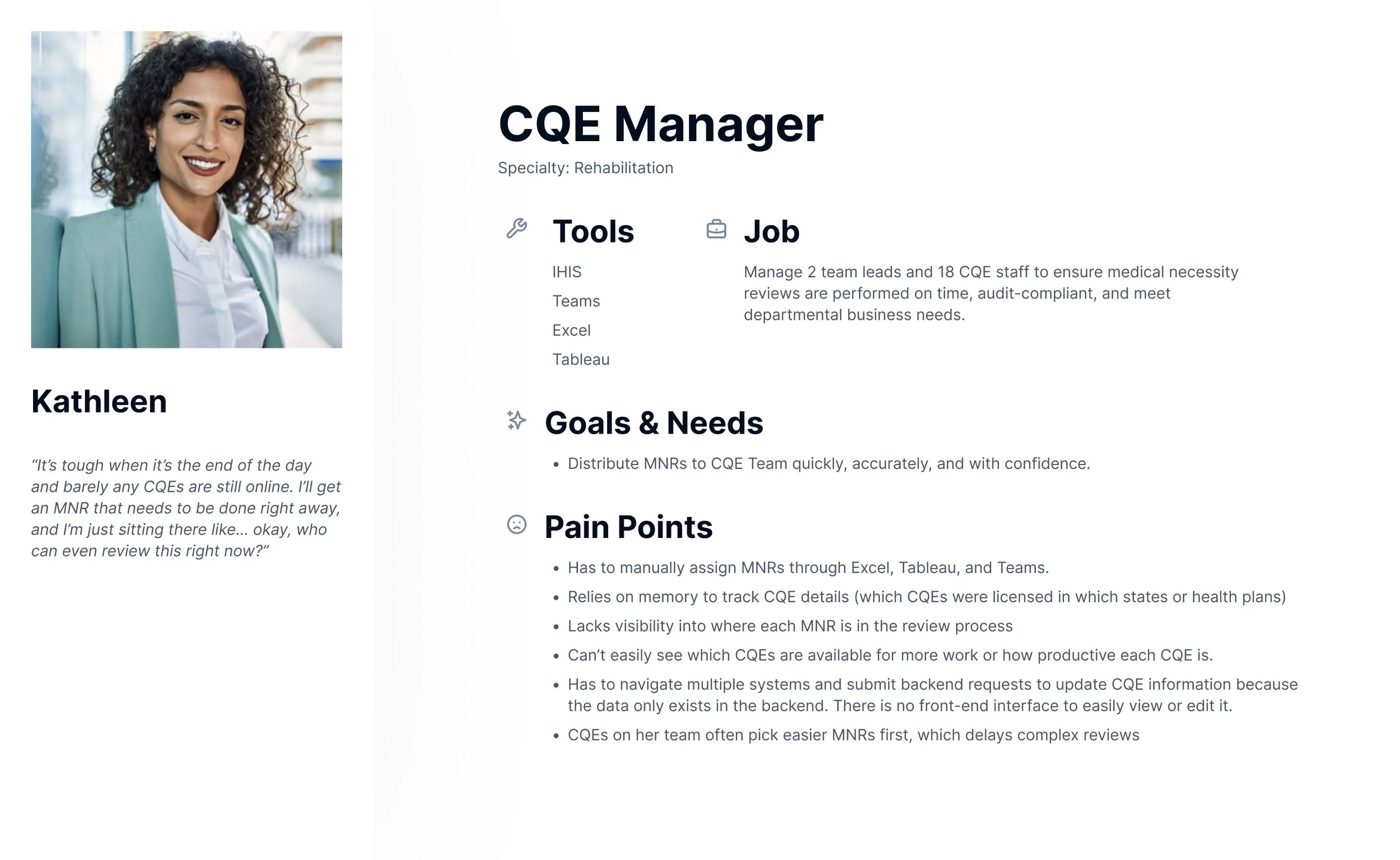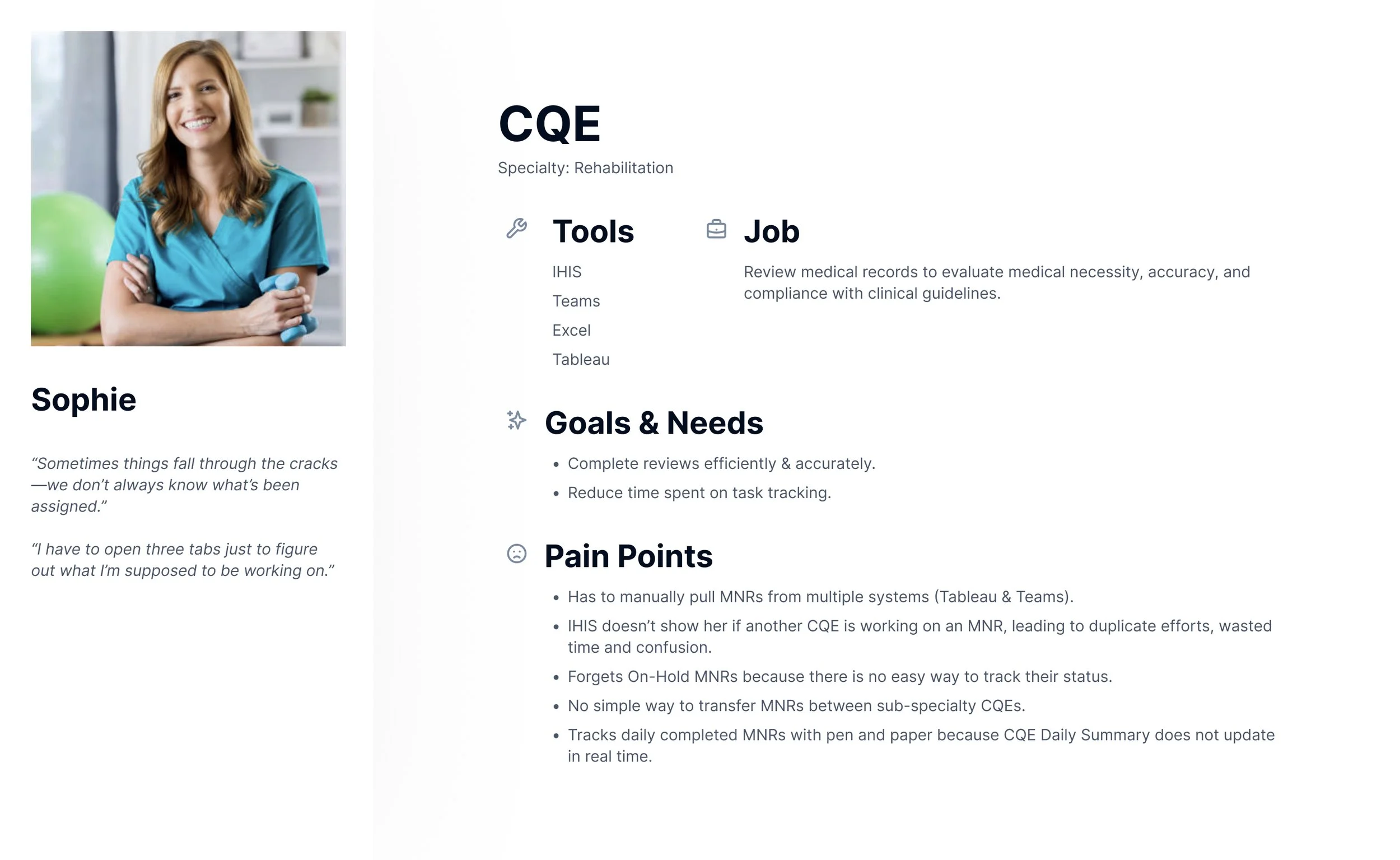 ASH’s MNR reviews span Rehab, Chiro, and Acupuncture. Because Rehab makes up 70% of the CQE department, we prioritized their workflows first to maximize impact, while ensuring the solution could scale to Chiro and Acu later.