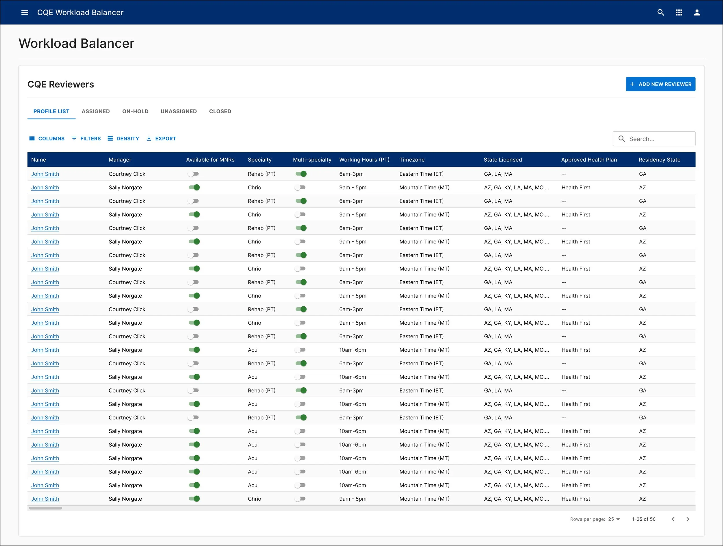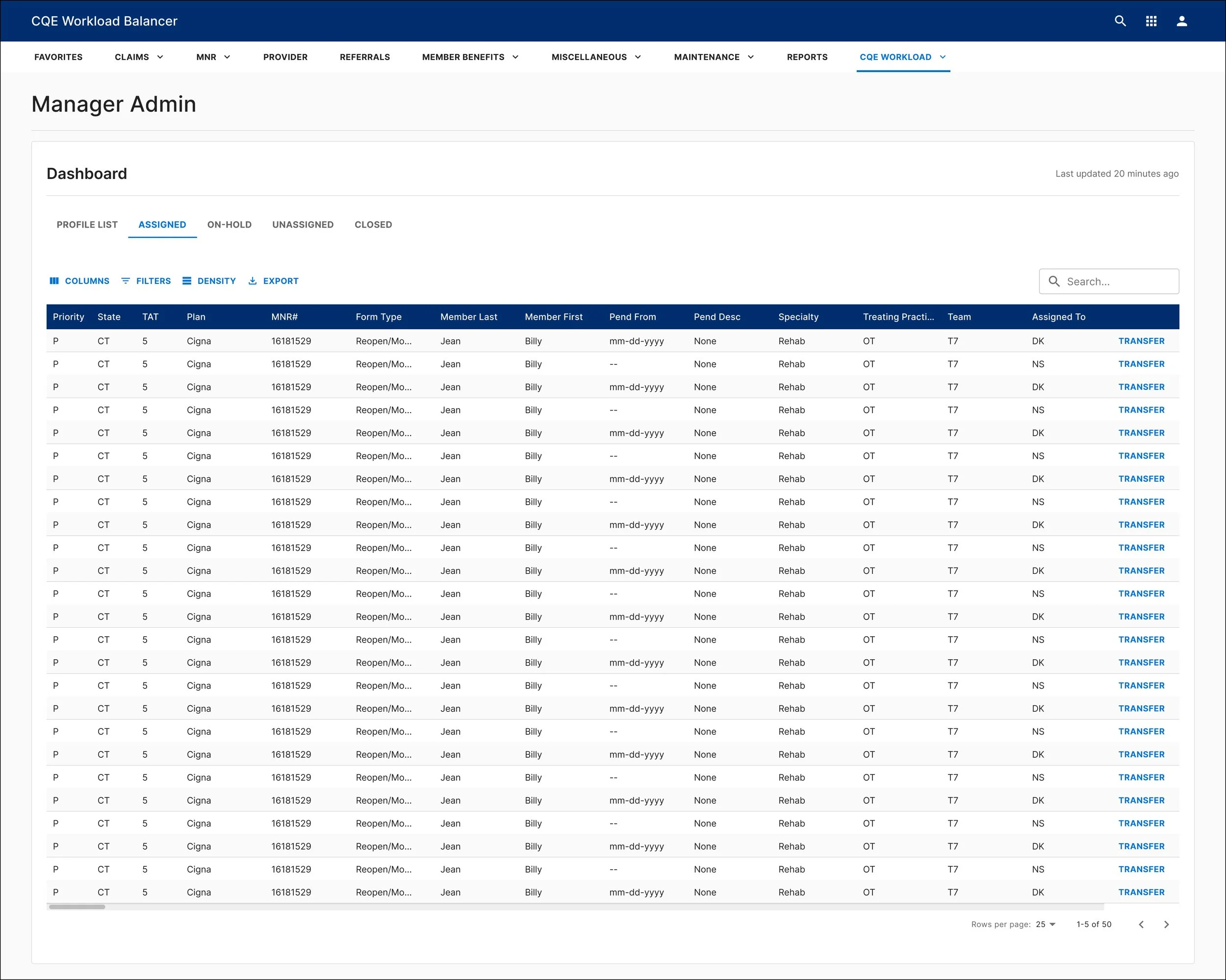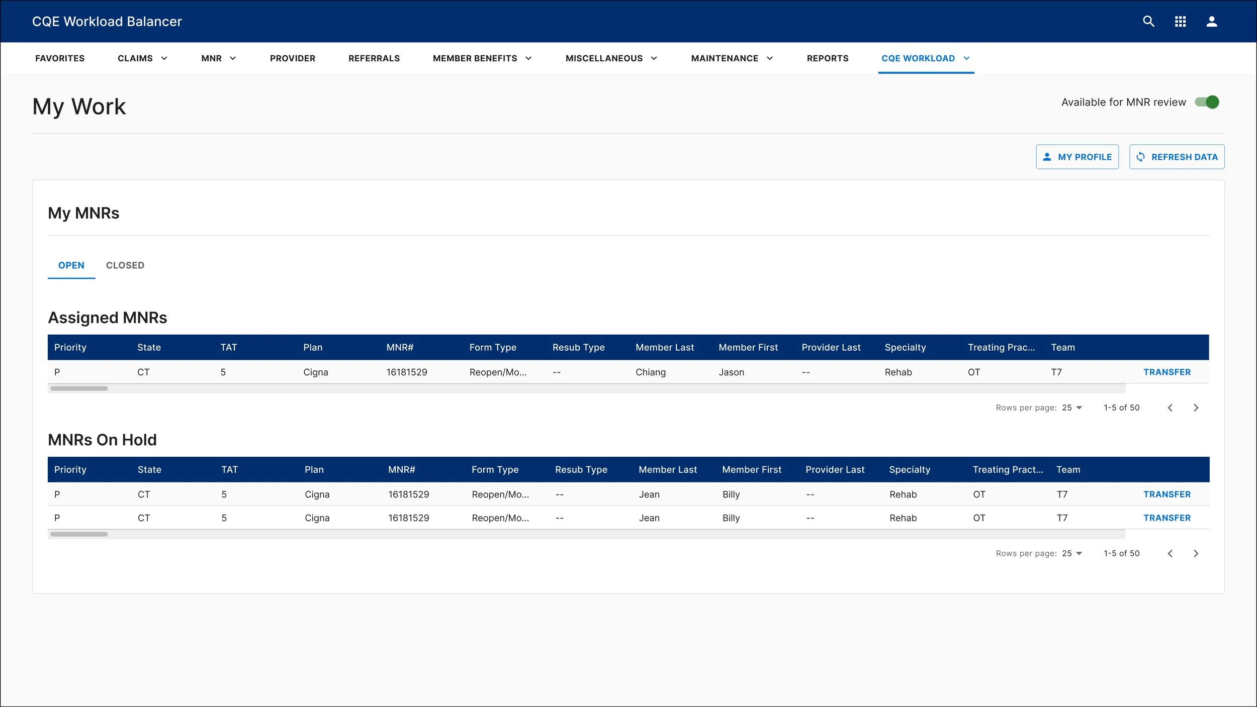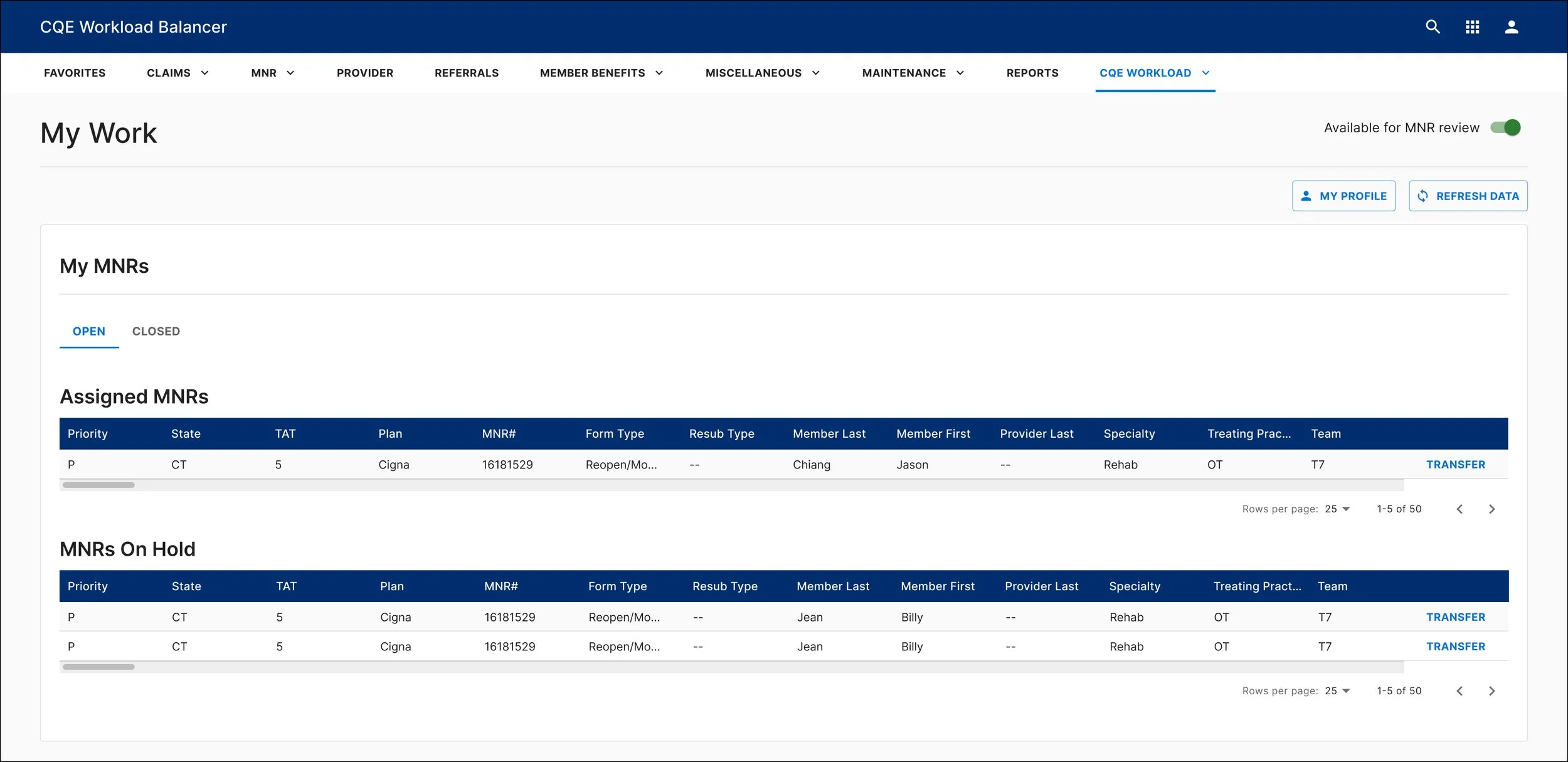 The Manager Admin screen automatically assigns MNRs to CQEs and gives managers an at-a-glance view of their team’s workload.