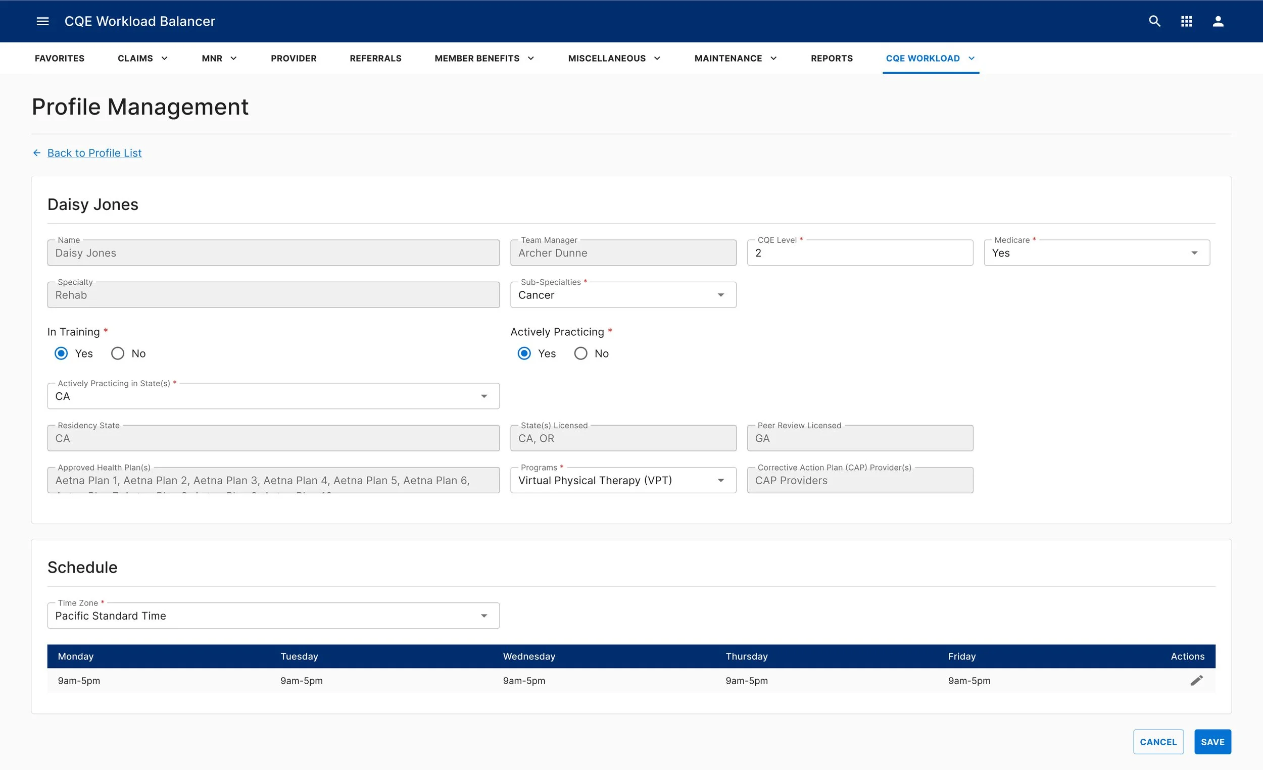 The Profile Management screen gives managers a centralized place to view, edit, and create CQE profiles.